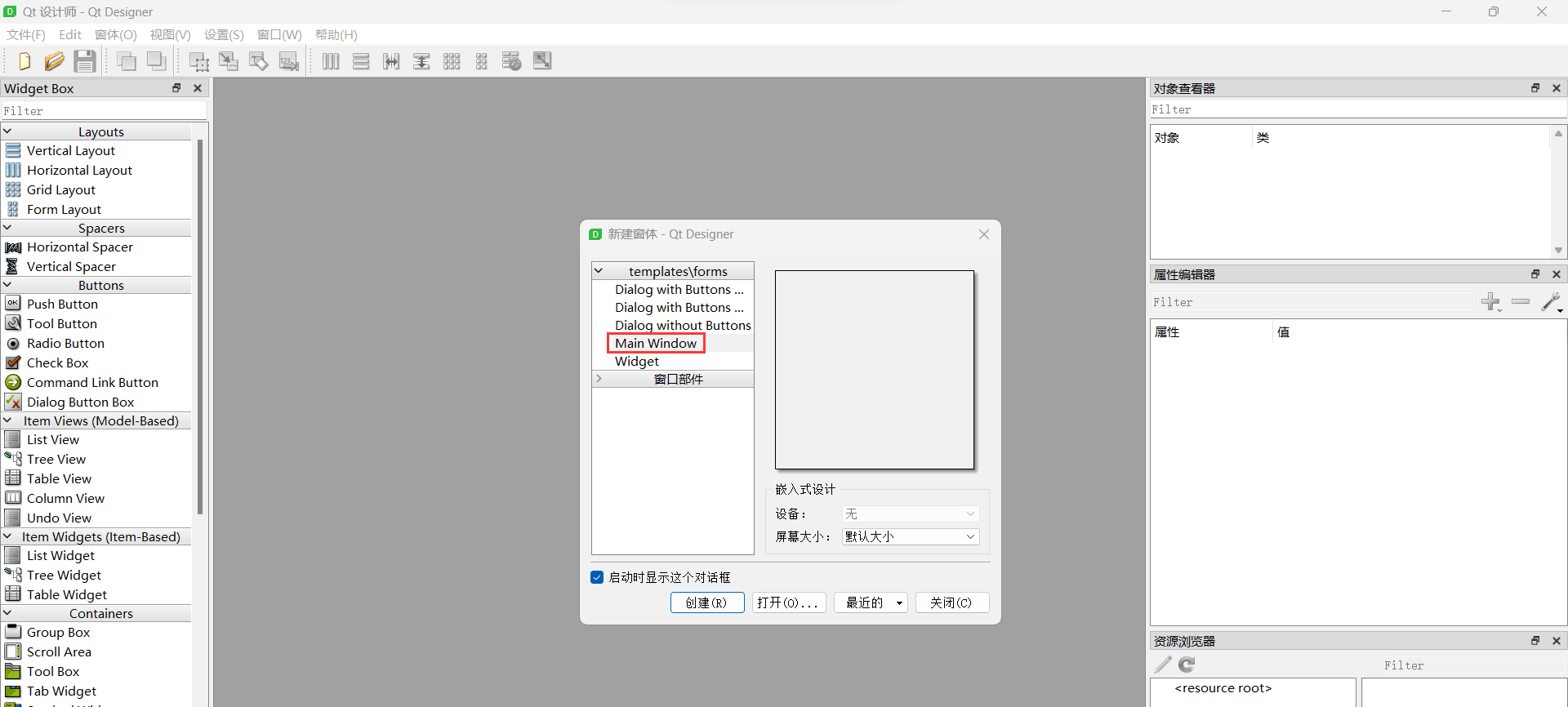 新建一个工作区文件夹,在资源管理器空白处右击选择 PYQT: New From,即可打开 QtDesigner,选择 Main Window 新建一个窗口。